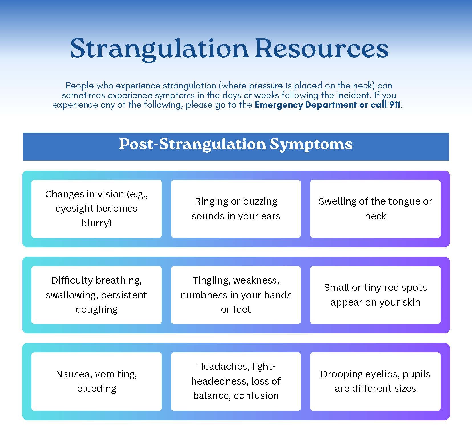 If you've experienced any pressure placed on your neck, it's important to get checked out medically as there could be internal injuries. Look through the resources below to find out what signs to look for and where to go for help.